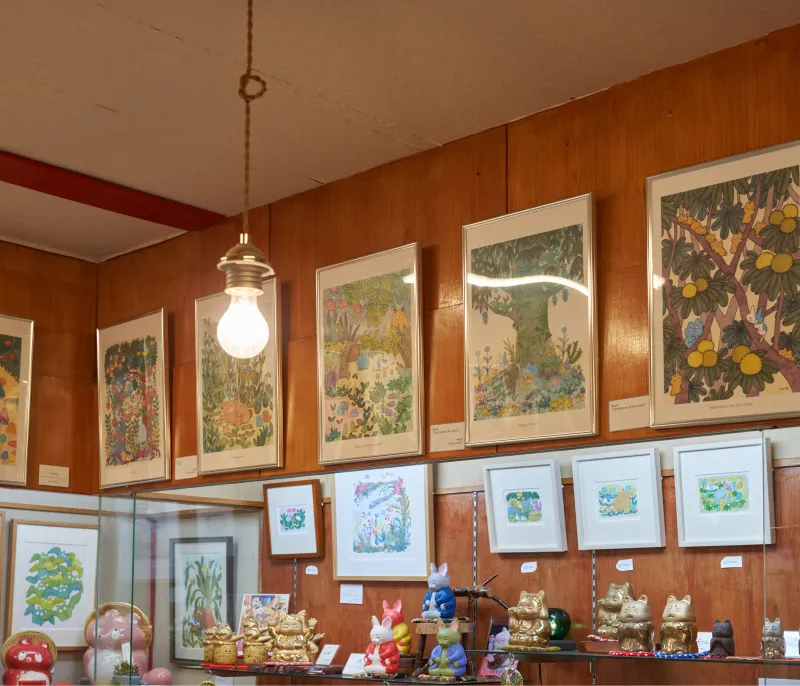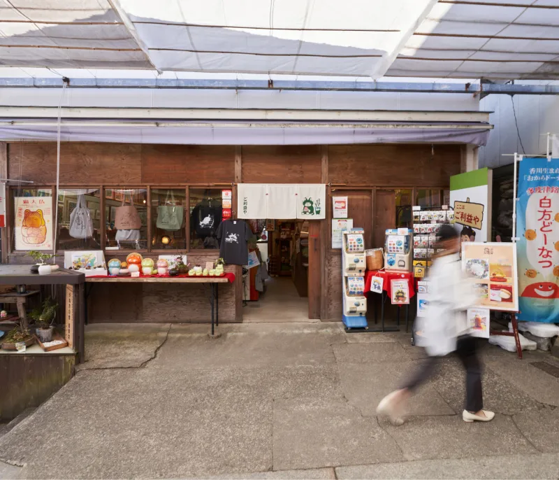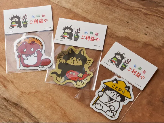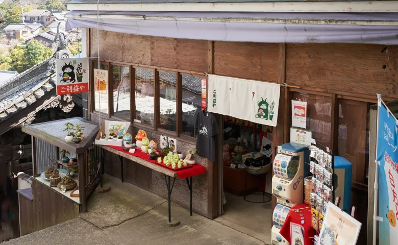 こんぴらさんへ続く長い階段の途中にふと現れる「ご利益や」。画家・ヒダカナオト描き下ろしのキャラクターグッズや原画と、カフェでのおもてなしで、皆さまへご利益が降り注ぎますように。