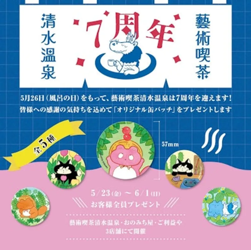 今年5月26日(風呂の日)に迎える創業7周年を記念して、藝術喫茶 清水温泉が周年を迎えます!感謝を込めて、ヒダカナオト描き下ろし57mmサイズのNEW缶バッジを、ご飲食・お買い上げ頂きましたすべてのお客様にプレゼントいたします。