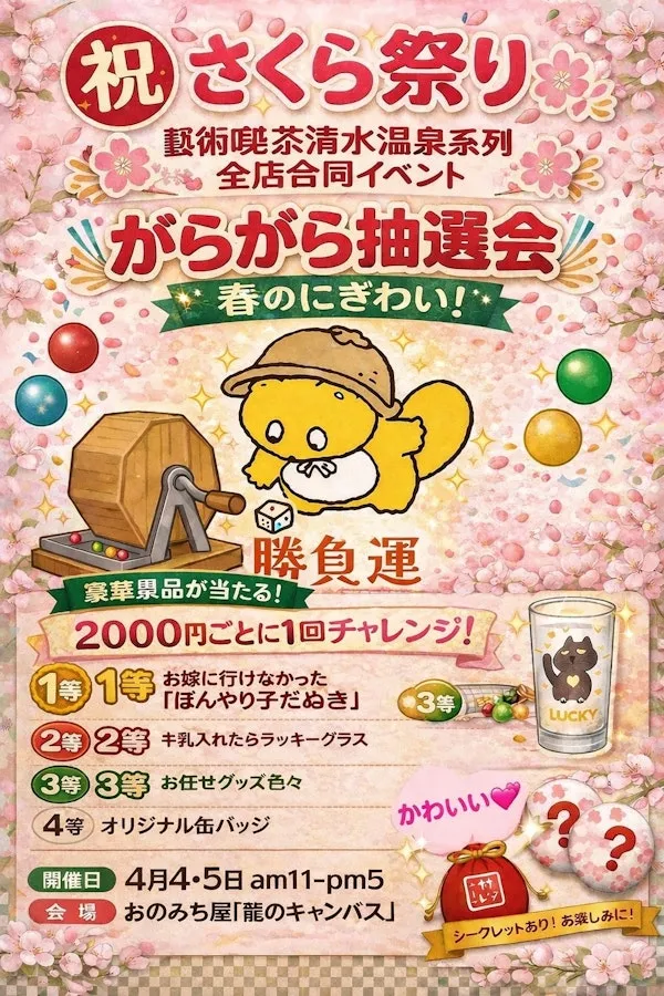 この度、日頃の感謝を込めまして、藝術喫茶清水温泉系列の全店合同イベント『祝 さくら祭り ~春のにぎわい!~ がらがら抽選会』を開催中です!
